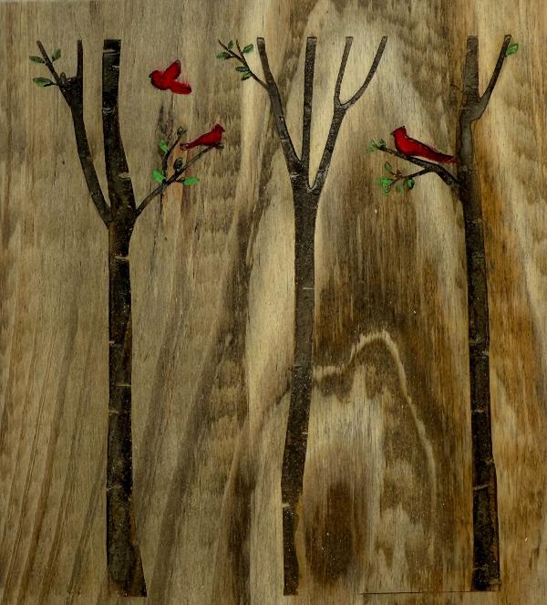 Transform reclaimed wood pallets with eco-friendly paint to depict vibrant cardinals set against a backdrop of forest trees.